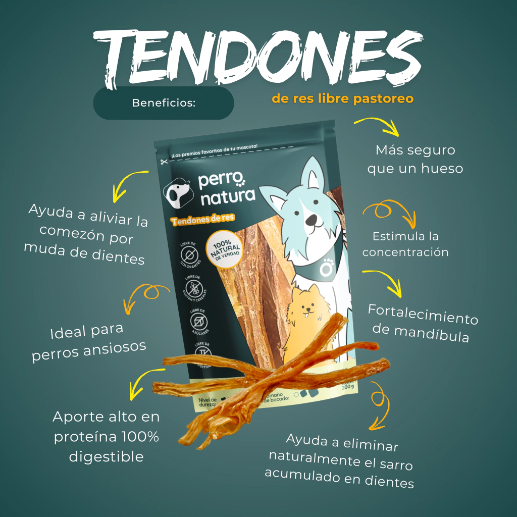 Tendones de Res de Libre Pastoreo 100% natural, sin aditivos ni conservadores, ¡son más seguros que un simple hueso! Dale a tu perro el placer de disfrutar un masticable que contribuye a su bienestar y salud dental. ¡Regálale momentos de felicidad y salud con Perro Natura! 🌟